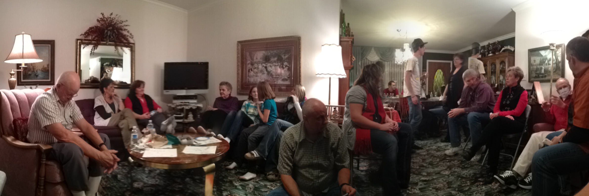 We didn’t have tons of pictures from the party this year, but Jason did take this cool panoramic picture, with his iPhone which shows everyone just hanging out having a good Christmas Eve together.