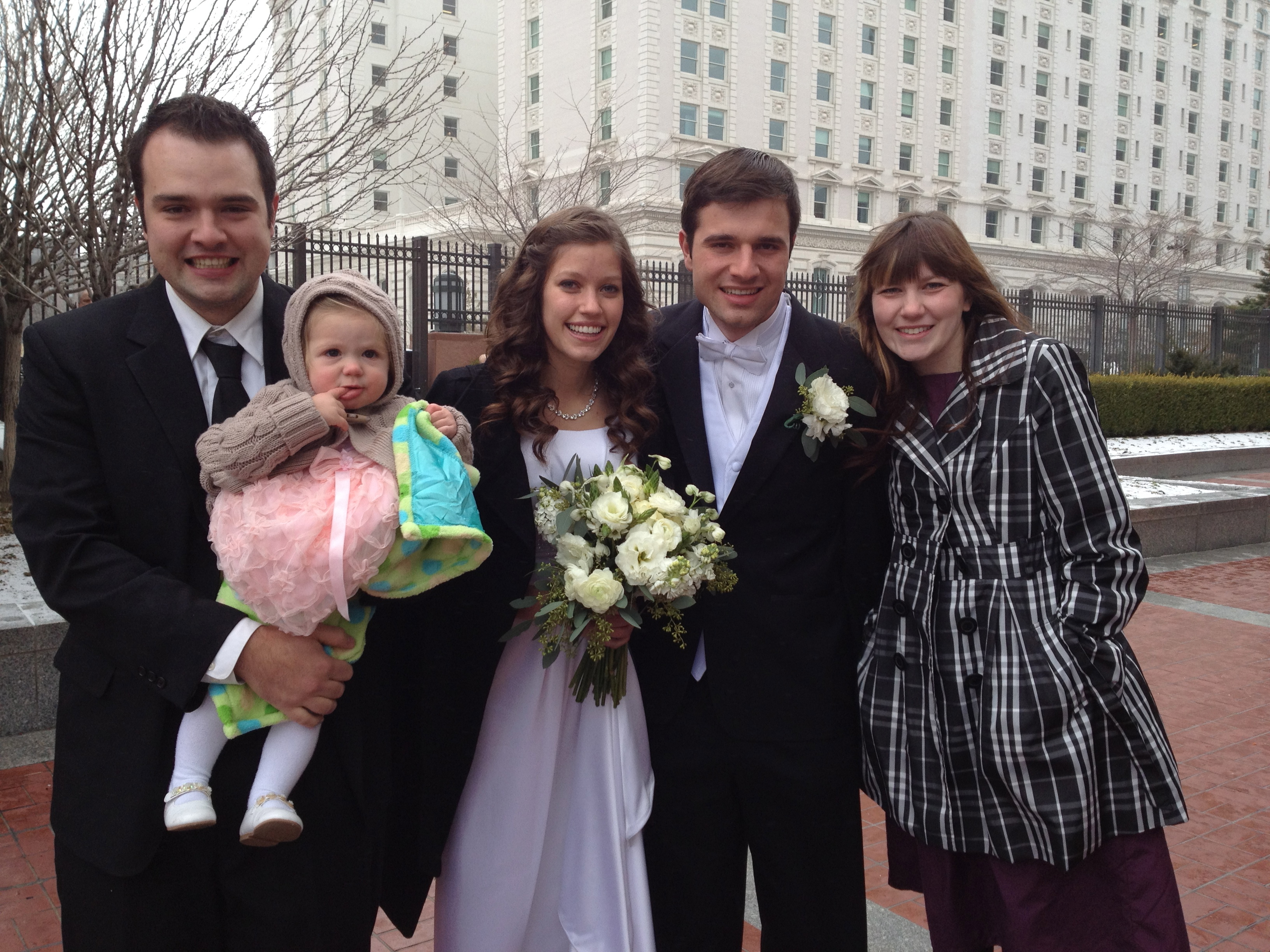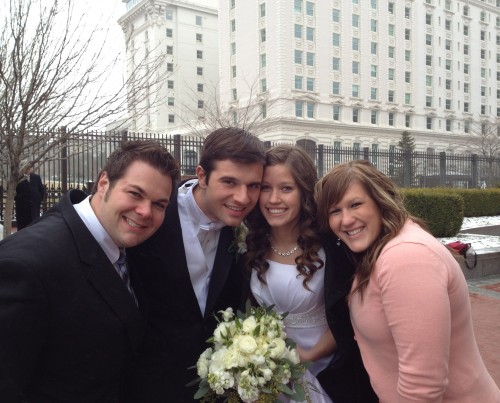 Remember Wyatt Felt, the little kid that I use to babysit all the time? Well, he is all grown up now and married to the love of his life, and we are so excited for him. Him and Rebecca were sealed in the Salt Lake temple on December 19th, 2011. The wedding ceremony was early in the morning and was attended by close family and friends; is was beautiful. After the wedding were pictures outside. Being December and in Utah it had been raining all morning and it was FREEZING! But the skies cleared long enough for pictures to be taken before it started raining again. Phew!