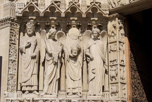 I love these statues that are carved into the side of the wall next to the entrance. The guy holding his head in his hands is St. Denis who was beheaded for converting to Christianity and became a warning to others who thought about forsaking the Roman Gods. The legend goes that when his head was cut off, he got up, tucked his head under his arm, paused at a fountain to wash off, and headed North until he found the right place to meet his maker. The Parisians were convinced by this miracle and that’s when Christianity gained ground.