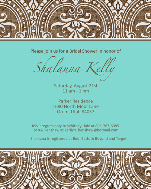 My Bridal Shower was so much fun! It was planned by Elaine and Whitney with extra help from Kster and Sheena. They all did such an amazing job! From the invitations, to the decorations, down to the drinks, not one thing was overlooked or unplanned. Here is the cute invite Whitney put together from scratch! She is awesome at invitations, birth announcements, and holiday cards. So cute!